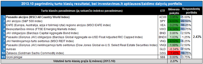 Kaip matome iš pateikto paveikslėlio sėkmingiausiai spalio mėnesį sekėsi būtent JAV akcijoms [SPY] ir šią turto klasę pasirinko net 22.5% respondentų. Kitą vertus, antroji pagal populiarumą – žaliavų pozicija [GSG] (18.75%) pasirodė prasčiausiai. Taigi pagal respondentų turto klasės pasirinkimus suformavę bendrą apklausos dalyvių portfelį galime teigti, jog kolektyvinis respondentų portfelis spalį sugeneravo +2.43% rezultatą (skaičiuojant pagal ETF kainų pokytį) ir apklenkė lygių proporcijų portfelį (į visas turto klases po 10%, grynųjų pinigų neįtraukiame), kuris paaugo +2.27% (visi rezultatai skaičiuojami JAV doleriais)