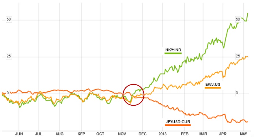 Žemiau kaip tik pateikiame Japonijos akcijų rinkos bei Japonijos valiutos pokyčius per pastaruosius vienerius metus. Kaip galima pastebėti, praėjusių metų pabaigoje į valdžią atėjęs naujas Japonijos centrinio banko vadovas prakalbo apie ypač agresyvią pinigų spausdinimo politiką, kas iš karto gana ženkliai teigiamai įtakojo Japonijos akcijų kursus bei labai neigiamai Japonijos jenos valiutų kursą JAV dolerio atžvilgiu. Tačiau net ir įvertinus jenos kurso smukimą, investavusieji į Japonijos akcijas gali džiaugtis vienais iš geresnių investicinių rezultatų šiais metais.